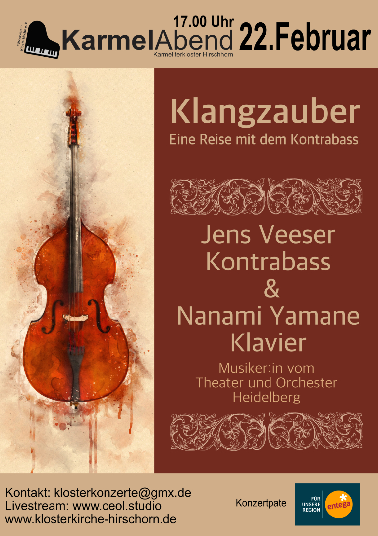 Das Duo Jens Veeser (Kontrabass) und Nanami Yamane (Bechsteinflügel) präsentieren ein wahrhaft zauberhaftes Programm! Ihre Wahl fiel nicht ohne Grund auf Pergulesi, Dragonetti und Vesser selbst. Beide spielen im Heidelberger Orchester und geben sich diesmal die Ehre im historischen Kapitelsaal / Kloster Hirschhorn. Ein Klangerlebnis besonderer Art!